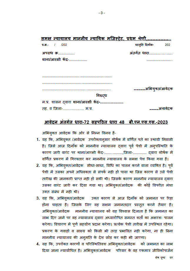 A bail application is a formal request submitted before a competent criminal court seeking the release of an accused person during the pendency of trial. Under the newly enacted Bharatiya Nagarik Suraksha Sanhita, 2023 (BNSS 2023), provisions relating to bail are primarily governed by Section 48 BNSS, while situations involving warrants and appearance may involve Section 72 read with Section 48 BNSS.